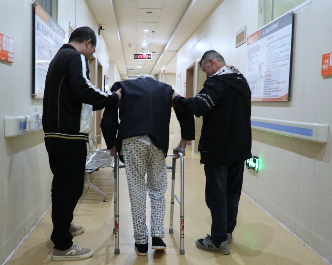 高龄与创伤叠加,让黄爷爷术后相继出现贫血、低钾血症,甚至引发重症肺炎伴呼吸衰竭,病情多次危急。骨科医护团队立刻开启“全天候守护模式”:帮老人翻身、拍背,预防肺部感染;手把手指导肢体训练、肺功能锻炼,从抬腿到迈步,耐心陪伴每一个微小进步。