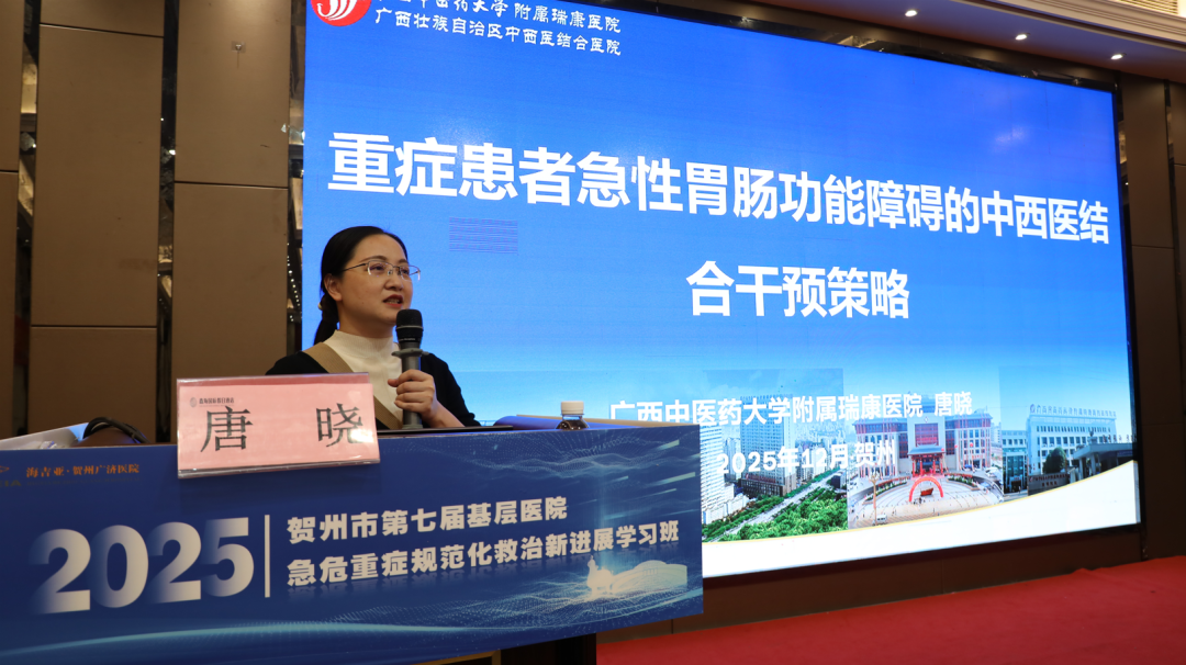 广西中医药大学附属瑞康医院重症医学科一区常务副主任唐晓作题为《危重患者胃肠功能障碍的中西医结合干预策略》专题讲座